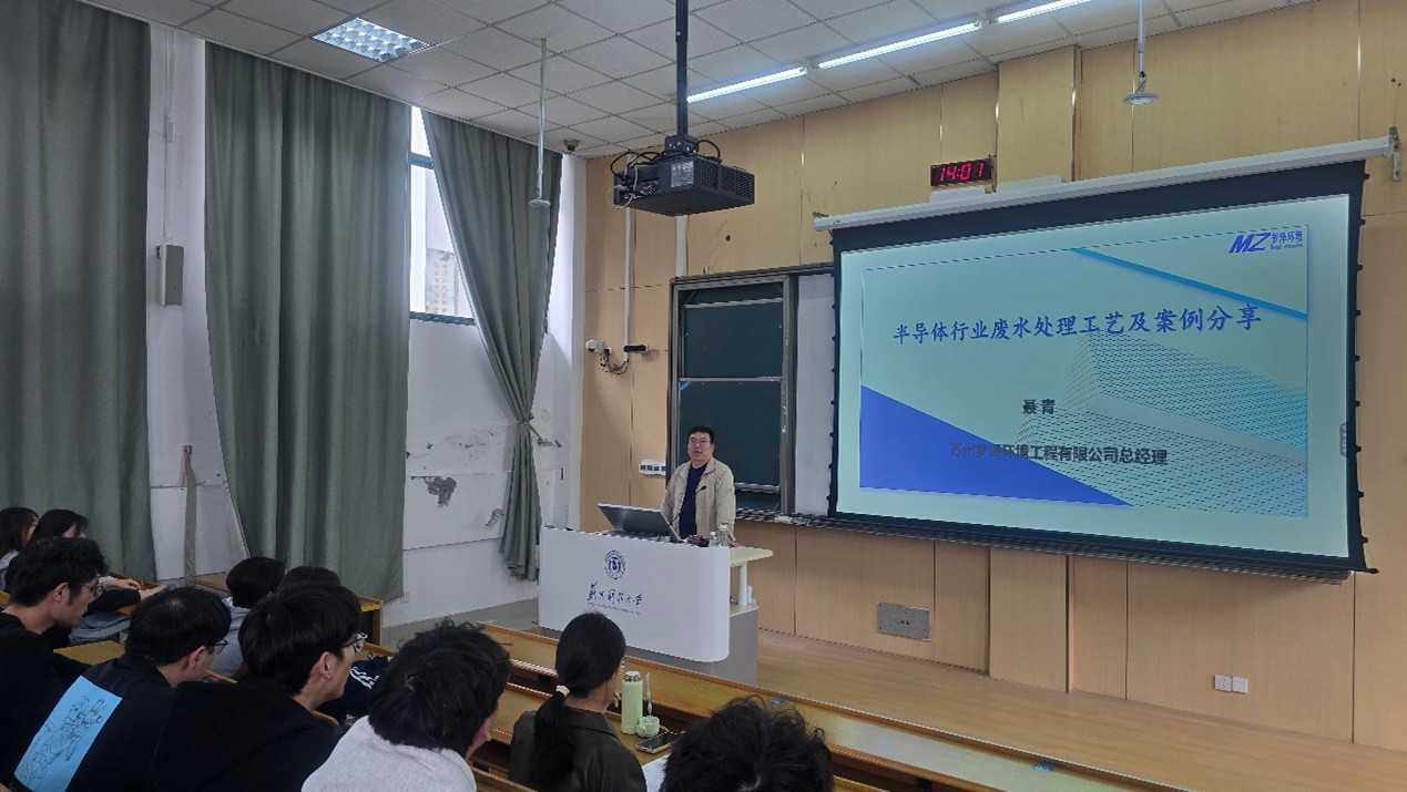 邀请苏州梦泽环境工程有限公司总经理、情色片优秀校友聂青走进课堂,在石湖校区C5-203为环境工程专业23级学生带来题为《半导体行业废水处理工艺及案例分享》的专题授课,环工系师生共百余人参加本次活动。