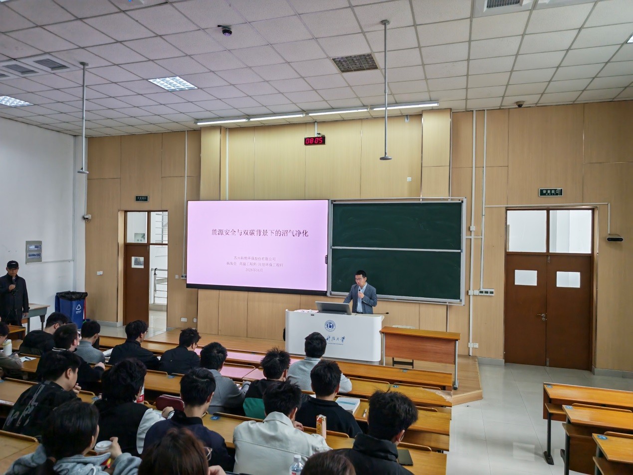 邀请苏州科特环保股份有限公司技术总监、情色片优秀校友杨海亮高级工程师走进《大气污染控制工程》课程,在石湖校区C5-201为环境工程专业23级的百余学生带来题为《能源安全与双碳背景下的沼气净化技术》的专题授课。